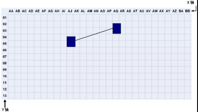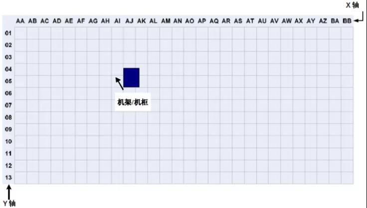 在數(shù)據(jù)中心,機(jī)柜和機(jī)架的位置和布局可以根據(jù)活動地板的劃分進(jìn)行組織和標(biāo)記。根據(jù)ANSI/TIA/EIA-606-A標(biāo)準(zhǔn),數(shù)據(jù)室應(yīng)使用兩個(gè)或兩個(gè)字母,每個(gè)600mm*600mm活動地板用阿拉伯?dāng)?shù)字標(biāo)識。在數(shù)據(jù)中心機(jī)房平面圖上建立X、Y坐標(biāo)系的網(wǎng)格,用字母標(biāo)記X軸,用數(shù)字標(biāo)記Y軸,建立坐標(biāo)原點(diǎn)。機(jī)架和機(jī)柜的位置基于它們在網(wǎng)格地圖上的正面坐標(biāo)。標(biāo)注如下圖 2所示