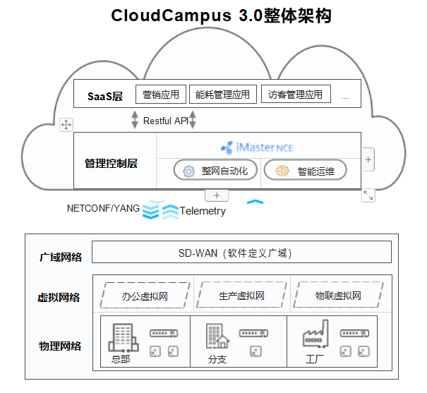 華為云園區(qū)網(wǎng)絡(luò)解決方案3.0 (CloudCampus 3.0) , 應(yīng)用IoT、Wi-Fi 6、 SDN、 SD-WAN、云管理和AI等 技術(shù),幫助企業(yè)構(gòu)建一張全無線接入,全球一張網(wǎng),全云化管理和全智能運維的園區(qū)網(wǎng)絡(luò)。從而,企業(yè)將受益于 極速的無線業(yè)務(wù)體驗,隨時隨地的自由協(xié)作和溝通,敏捷的云應(yīng)用上線,以及可靠的應(yīng)用體驗保障,讓大企業(yè)、政府、高校、普教、 醫(yī)療、零售、交通等各行業(yè), 在云時代抓住數(shù)字化轉(zhuǎn)型新機會。