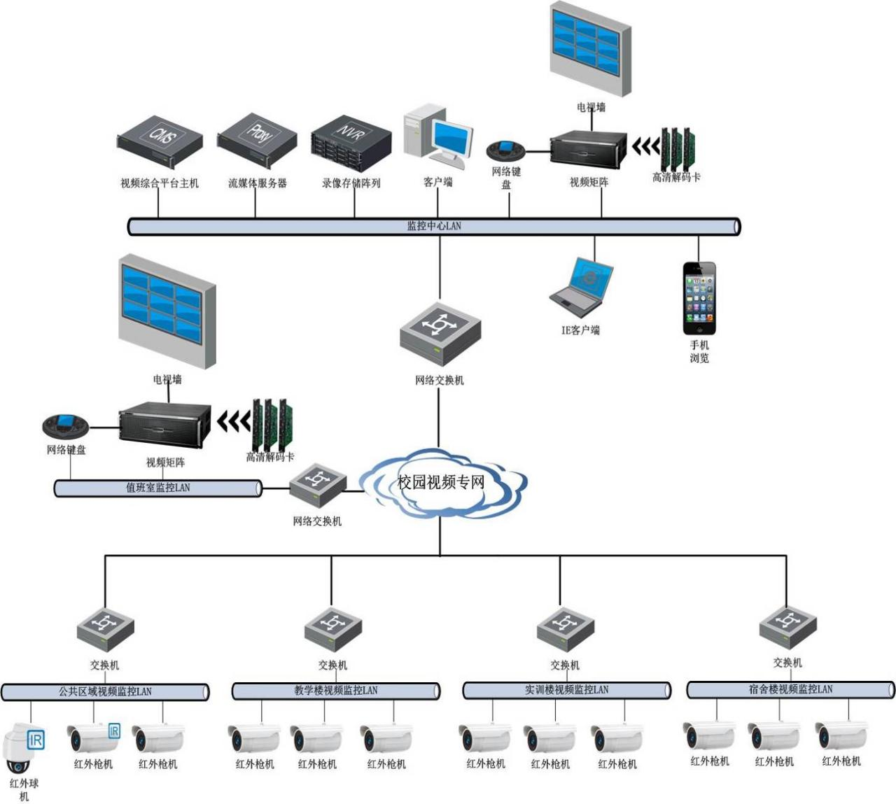(5)視頻監(jiān)控系統(tǒng)主要由前端攝像機(jī)組成,根據(jù)現(xiàn)場不同的環(huán)境和應(yīng)用選用不同的攝像機(jī),在出入口選擇紅外攝像機(jī),在樓梯口和走廊設(shè)置紅外槍式攝像機(jī)及寬動態(tài)紅外攝像機(jī),在周界可以選用紅外槍式攝像機(jī),在學(xué)院室外開闊區(qū)域選用室外球型攝像機(jī)等。